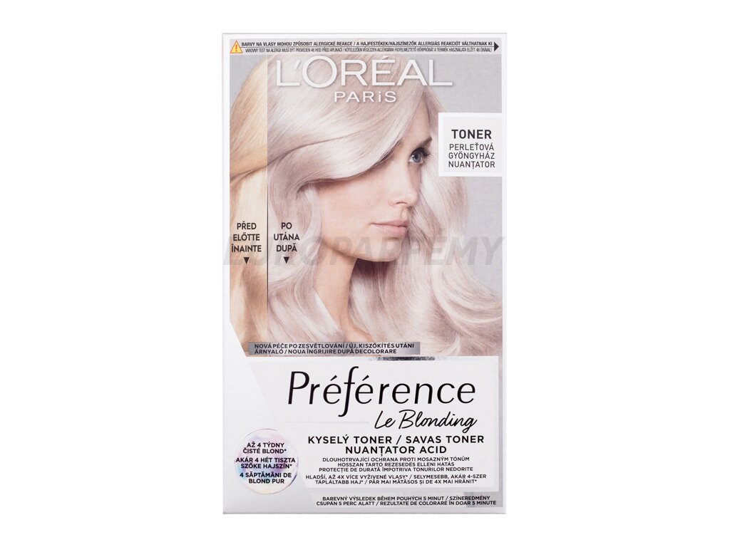L'Oréal Paris Préférence Le Blonding Toner je kyselý toner, který vašim blond vlasům zajistí dlouhotrvající ochranu proti mosazným tónům.