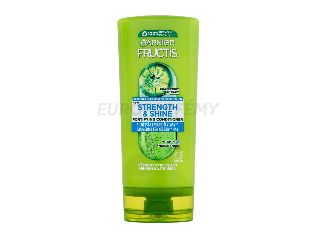 Kondicionér Garnier Fructis Strength & Shine Fortifying Conditioner s obsahem grapefruitového extraktu posílí vlasová vlákna, dodá jim až 3x větší lesk a osvěžující ovocnou vůni.