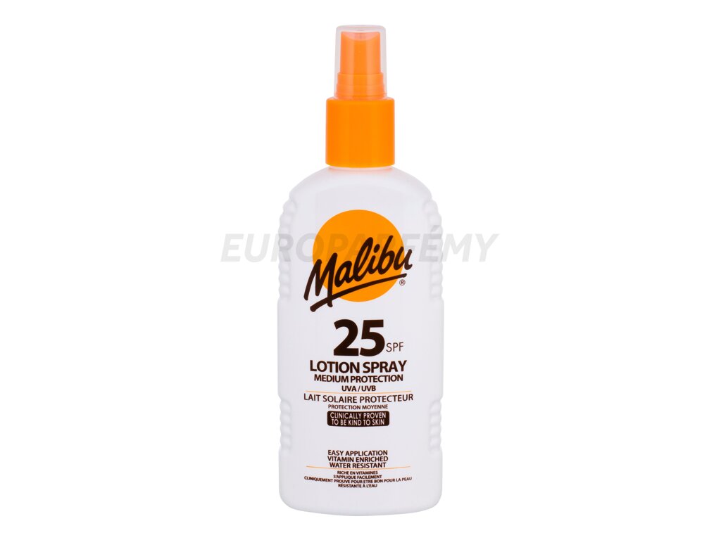 Voděodolný sprej na opalování Malibu Lotion Spray SPF25 chrání pokožku před slunečním zářením. Složení obohacené o vitamíny pomáhají udržovat přirozenou vlhkost pokožky. Praktické balení ve spreji umožňuje snadnou aplikaci. Snadno se roztírá a ihned vstřebává.
