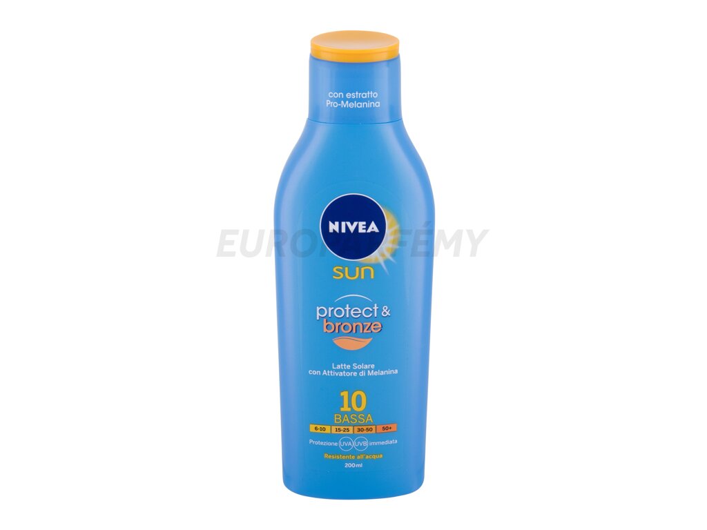 Mléko na opalování Nivea Sun Protect & Bronze Sun Lotion ochrání vaši pokožku před nežádoucími účinky slunečního záření a podpoří zhnědnutí, aniž by obsahovalo samoopalovací látky. Funguje na bázi přírodních výtažků, které aktivují tvorbu melaninu a tím i k rychlejšímu zhnědnutí pokožky.