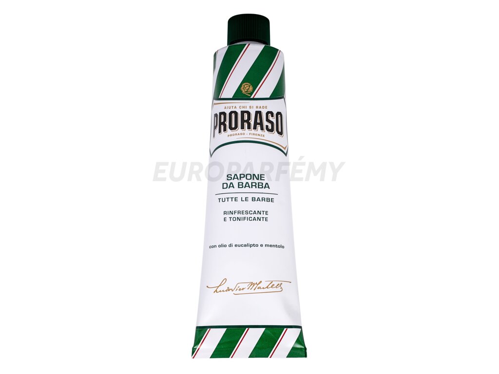 Mýdlo na holení v tubě PRORASO Green s glycerinovým základem obsahuje kokosový, eukalyptový a mentolový olej, díky nimž má na pleť osvěžující a chladivý účinek.