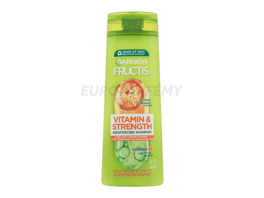 Hledáte řešení pro své slabé vlasy? Svěřte je do péče šamponu Garnier Fructis Vitamin & Strength Reinforcing Shampoo, který je posílí a vyživí od kořínků až po konečky. Jeho lehké složení obnovuje poškozenou strukturu vlasového vlákna a tím zabraňuje lámavosti. Přitom šetrně smývá usazené nečistoty i přebytečný kožní maz. Zanechá vaše vlasy čisté, lesklé a až 10x silnější.