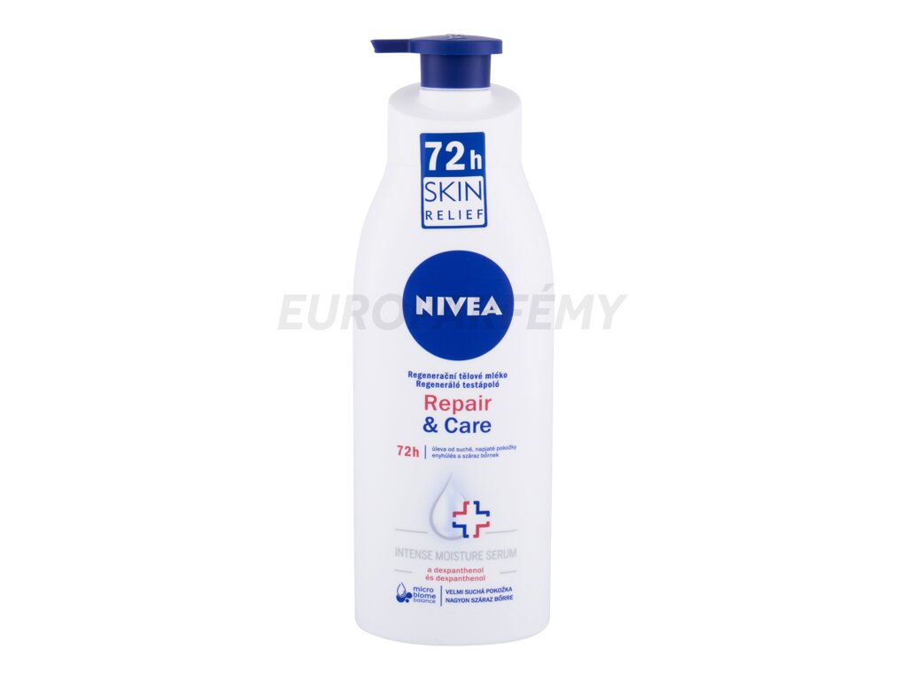 Tělové mléko Nivea Repair & Care 72h obsahuje hloubkově hydratační sérum a dexpanthenol, který pokožku regeneruje. Proto je vhodný zejména pro suchou a velmi suchou pokožku, které přináší okamžitou úlevu od pnutí a svědění.